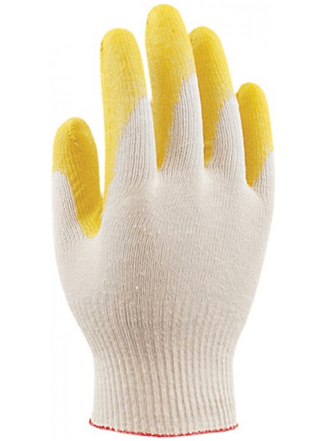 Рабочие трикотажные, хлопчатобумажные перчатки с одинарным покрытием слоем латекса на ладони.