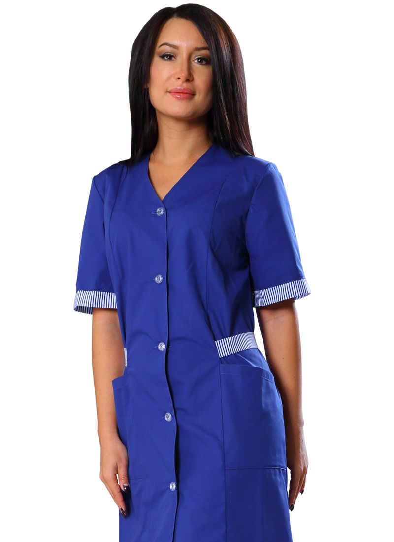 Халат с V-образной горловиной, с центральной бортовой застежкой на пять петель и пуговиц. Полочки с рельефами от линии плеча, с двумя нижними накладными карманами. Верхние срезы обработаны обтачками. Спинка с хлястиком. Рукава втачные одношовные, короткие, с отделочными манжетами.